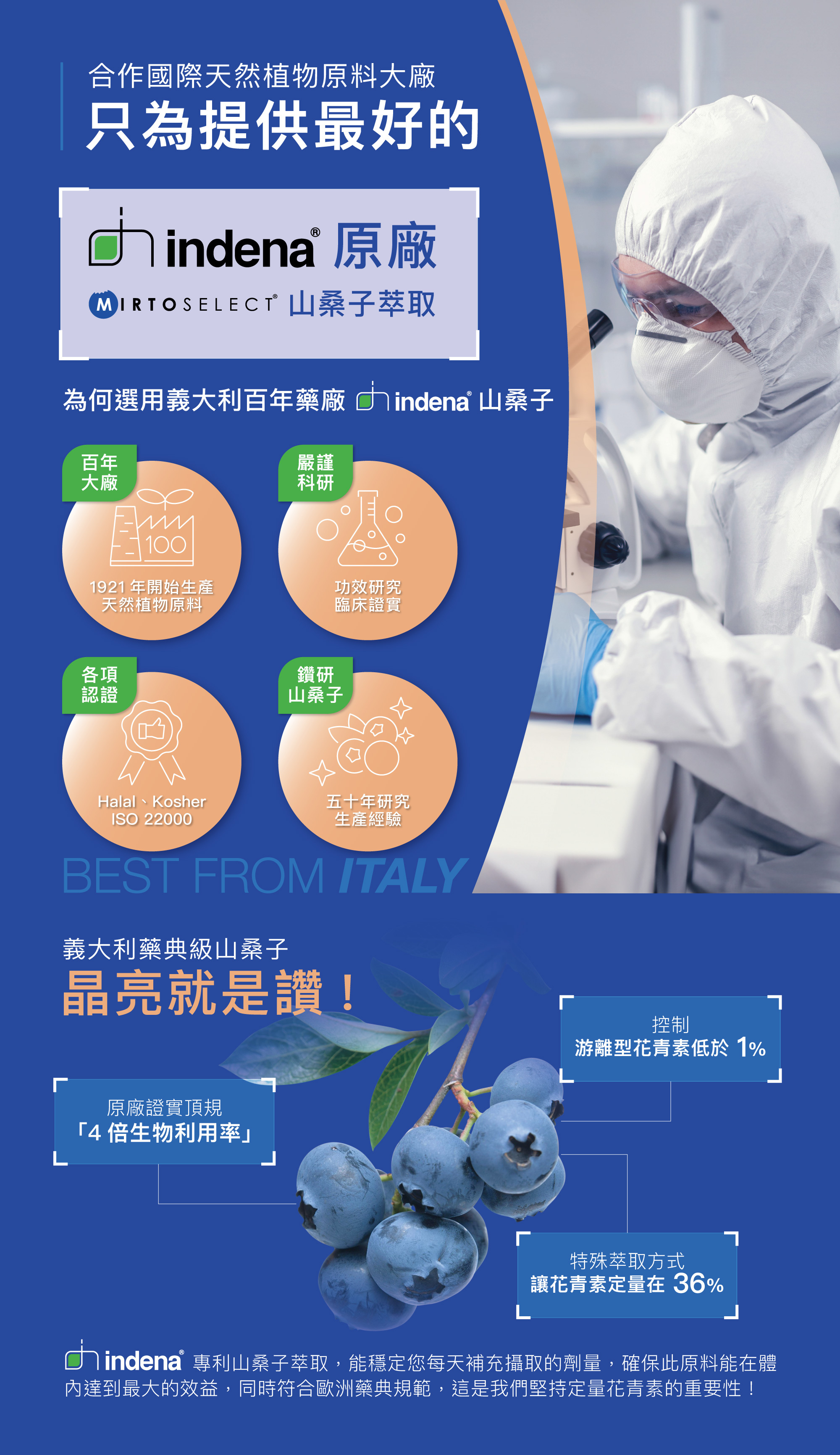 A: Mirtoselect® 是來自義大利的專利山桑子萃取物,經過 50 年研究,並通過歐洲藥典標準,富含 36% 花青素,且游離花青素低於 1%,使生物利用率比一般山桑子高4倍,確保高穩定性及優異吸收率。