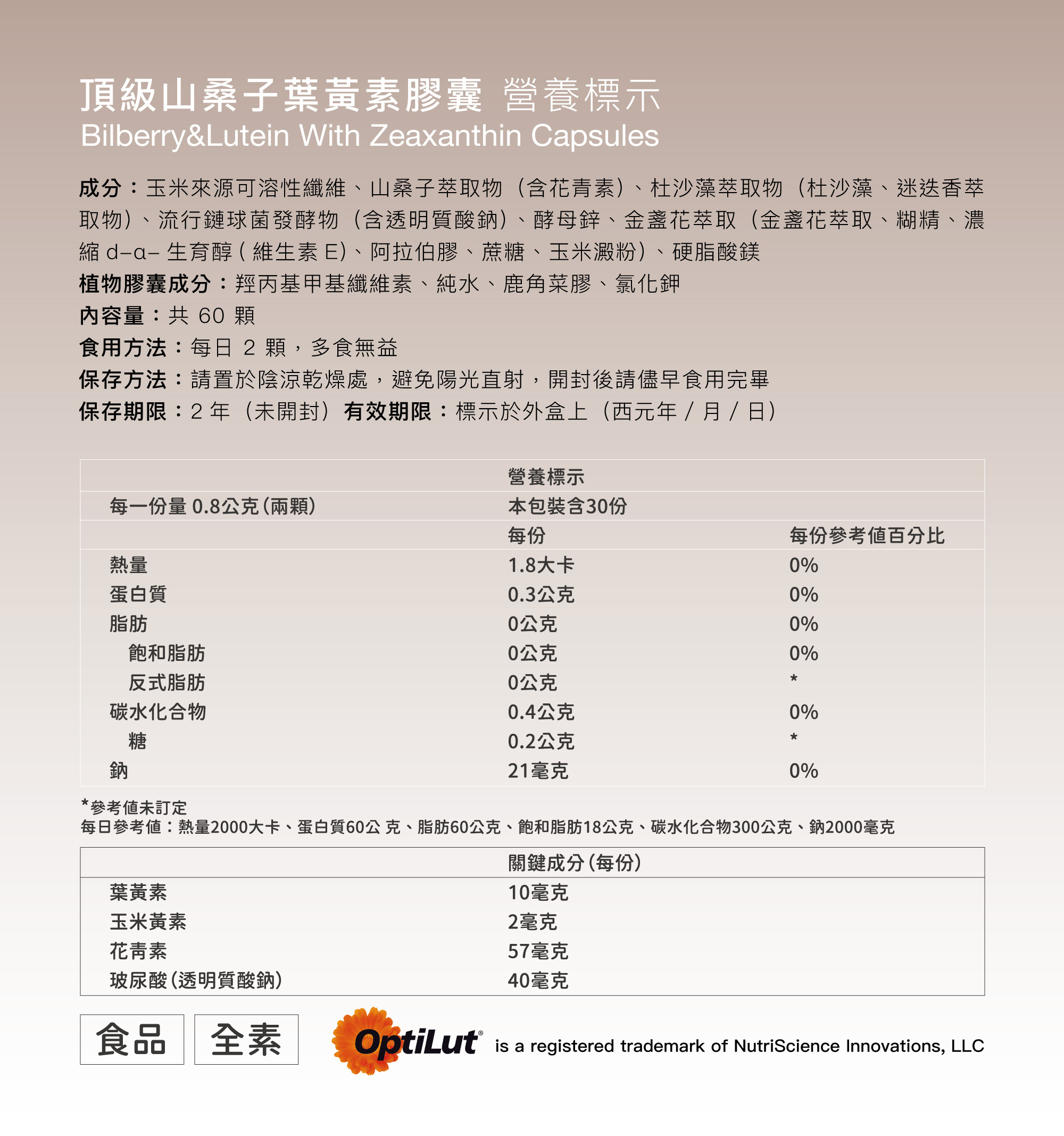 A: 本產品嚴選 Mirtoselect® 義大利專利山桑子萃取物,搭配 OptiLut® 高穩定葉黃素、玉米黃素 及 消旋玉米黃素,並添加酵母鋅、透明質酸鈉(玻尿酸)、專利水溶性膳食纖維,為均衡的日常營養補充方案。