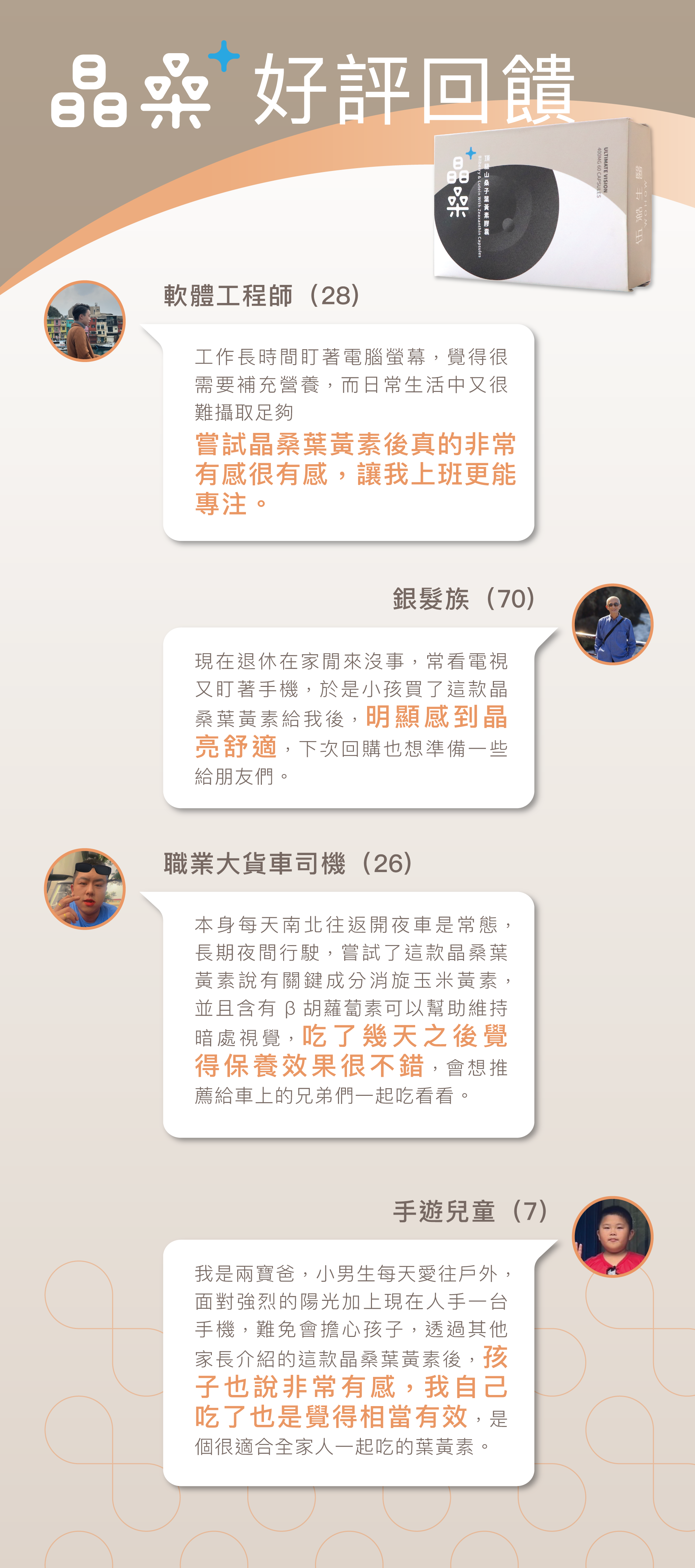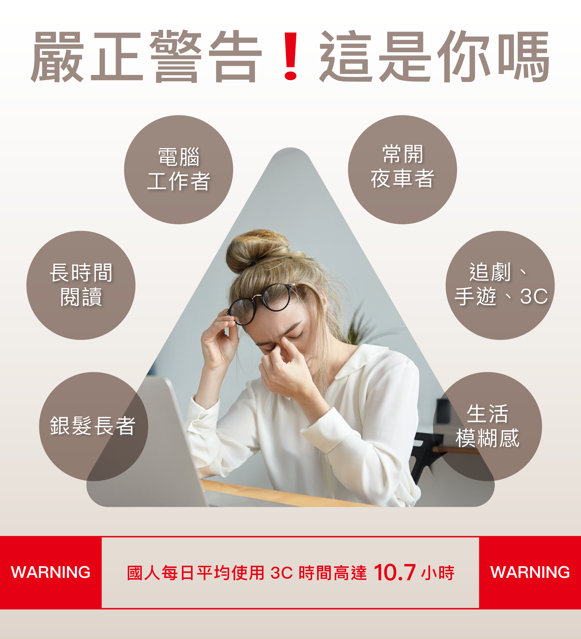 A: 3C族、學生族、素食族、銀髮族、長時間電腦工作者、常開夜車者、強光環境(如夏天的太陽)下工作者。
